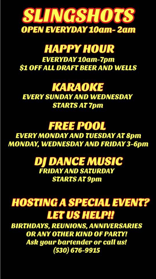 Welcome to Slingshots, your new favorite destination in Cameron Park, CA! Nestled at 3300 Coach Ln, this vibrant venue is more than just a bar—it's a hub for delicious food, lively atmosphere, and good company.
